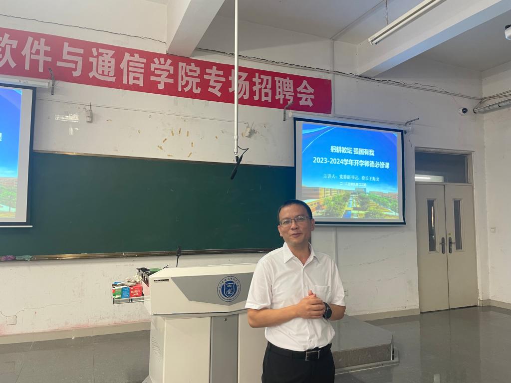 为深入贯彻落实党的二十大精神,进一步加强师德师风建设,牢固树立“躬耕教坛 强国有我”的志向与抱负,推动巩固主题教育成果走深走实,9月22日,党委副书记、校长王海龙为软件与通信学院和应用外国语学院党总支全体教职工做了“躬耕教坛 强国有我”2023-2024学年开学师德师风的宣讲教育。